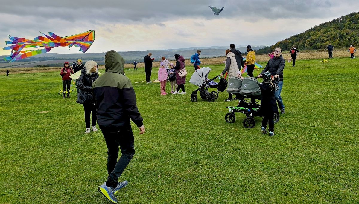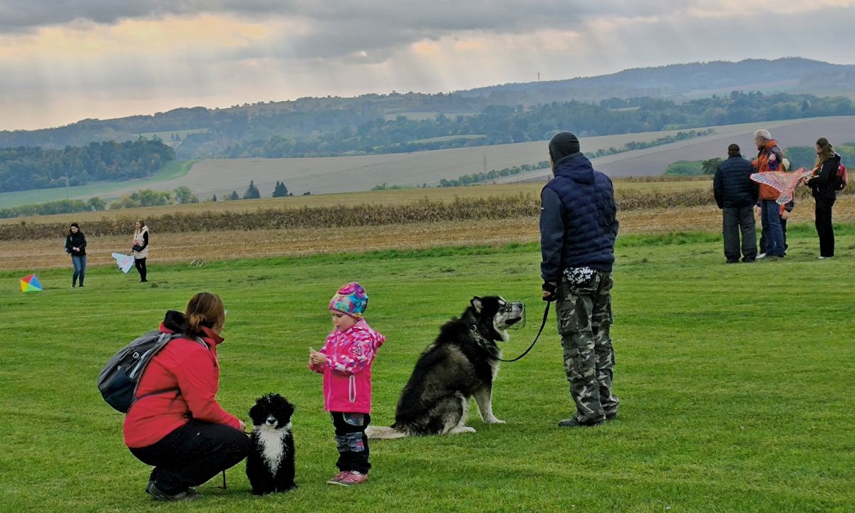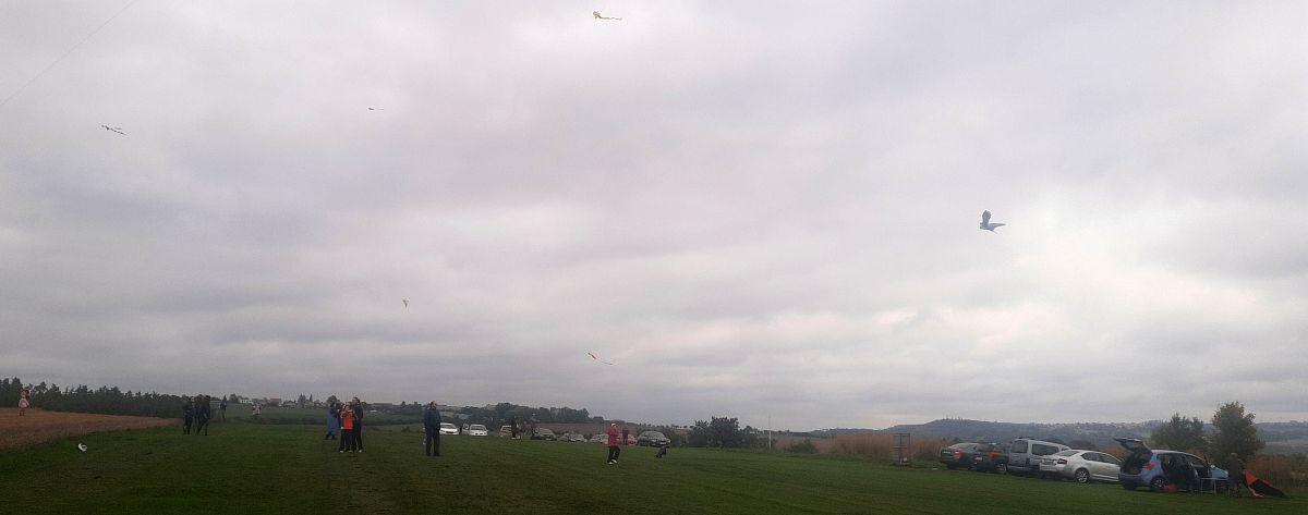 Dopoledne trochu mžilo a bylo zataženo, tmavo a docela už chladno. K polednímu se počasí moc nezlepšilo, černé mraky zůstaly a vítr foukal silnější (5-6 m/s) a dost nárazový. K začáku zahájení drakiády přišlo opět asi padesát rodičů s dětmi a další přicházeli a i díky počasí i odcházeli.