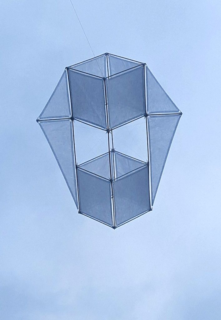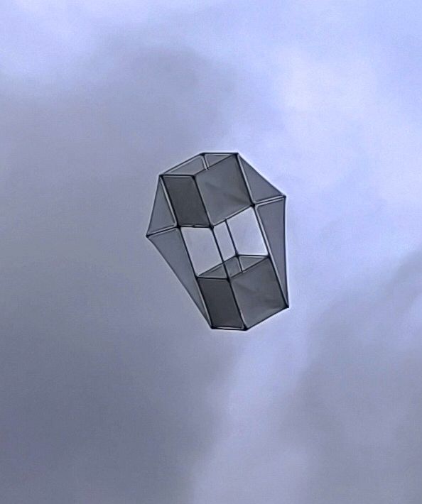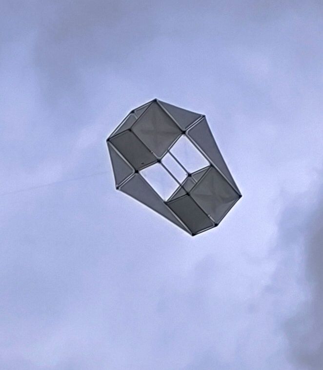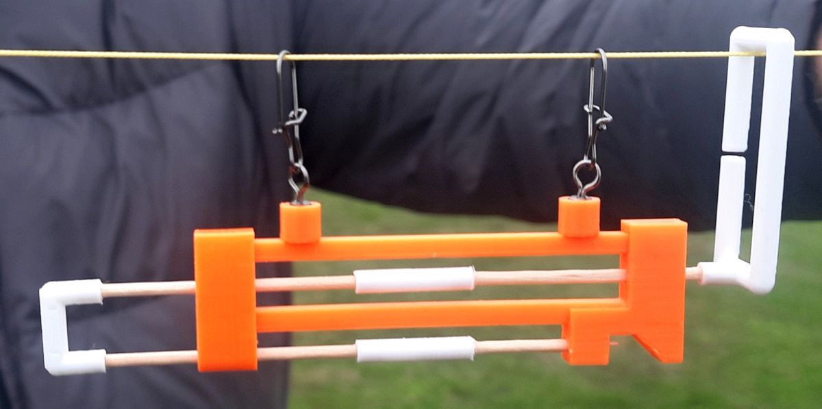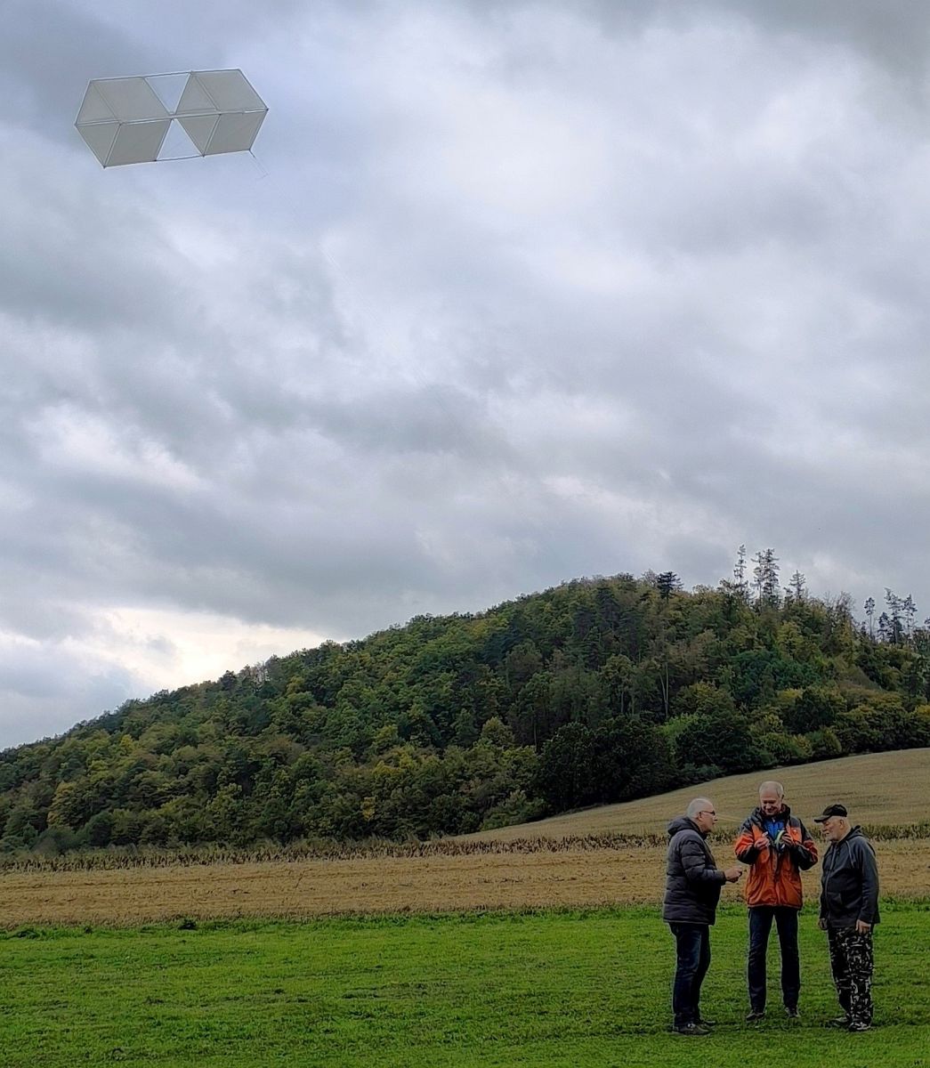 Až skoro ke konci drakiády přijel pán ze Zlína a dovezl ručně dělané krabicové draky. Měl je velice pěkně a profesionálně udělané ;-) Spojky, koncovky vypínacích lanek a pod. si tiskl na 3D tiskárně. Na tiskárně si vystikl i vozíček pro posílání "psaníček" drakovi po jeho šňůře. Tak jsme jej hned vyzkoušeli a vypustili parašutistu ;-)